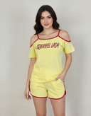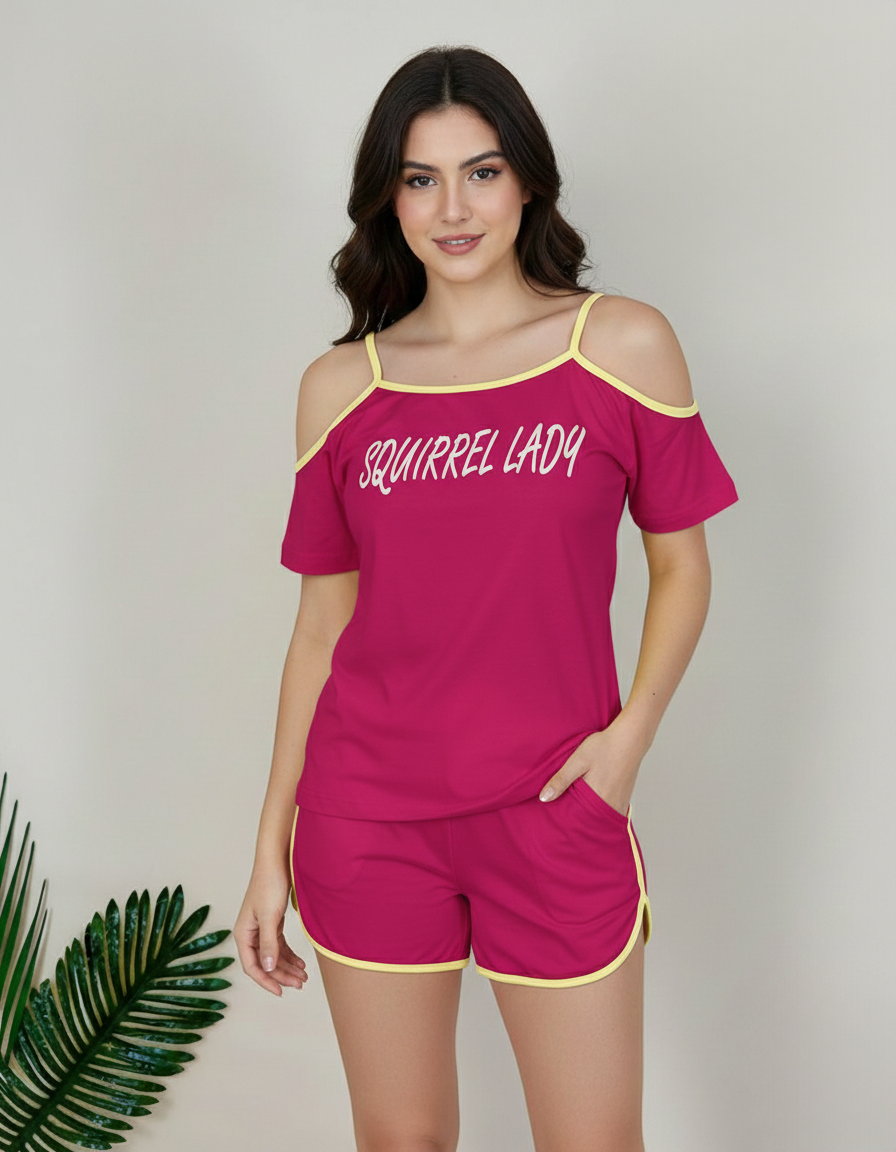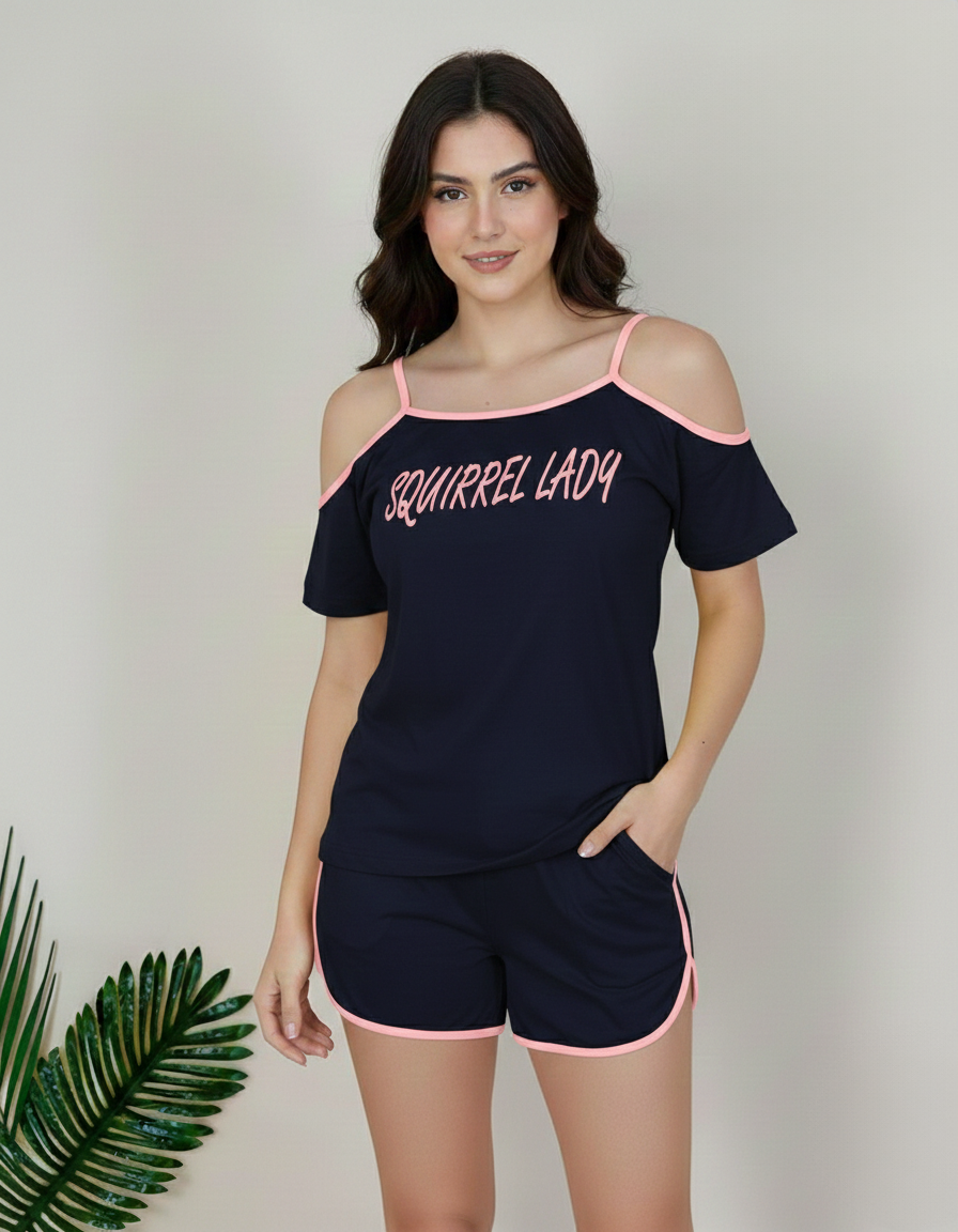 الگوی آفشولدر این لباس به گونهای طراحی شده که روی سرشانه ثابت میماند و با حرکت بدن مدام جابهجا نمیشود. آستینهای کوتاه و آزاد در کنار شورتک با لبههای هلالی، پاها را کشیدهتر نشان داده و آزادی حرکت کاملی را فراهم میکند.